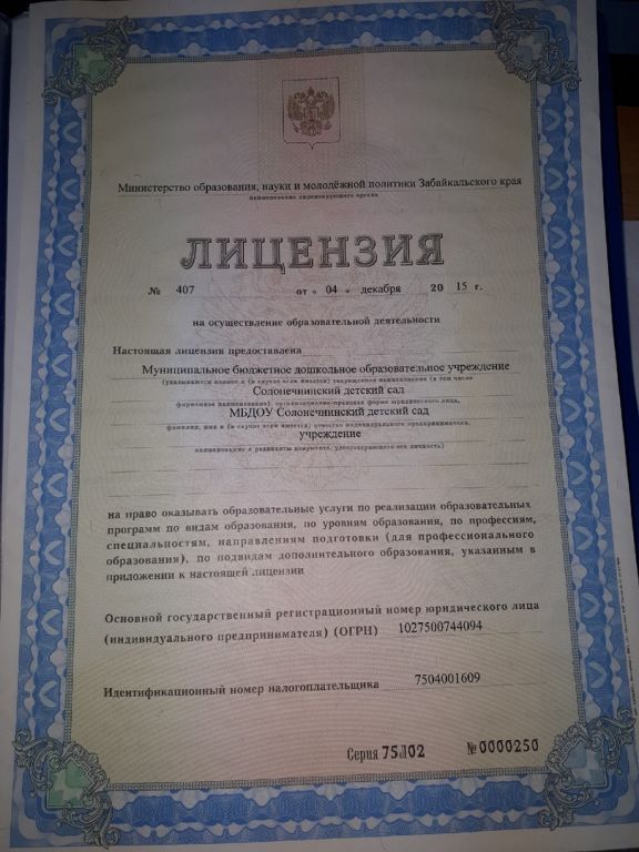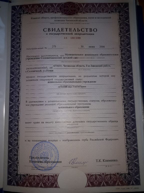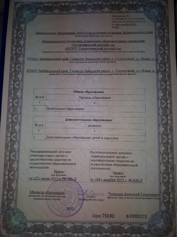 | Полное наименование образовательной организации* | Муниципальное дошкольное образовательное учреждение Солонечнинский детский сад |